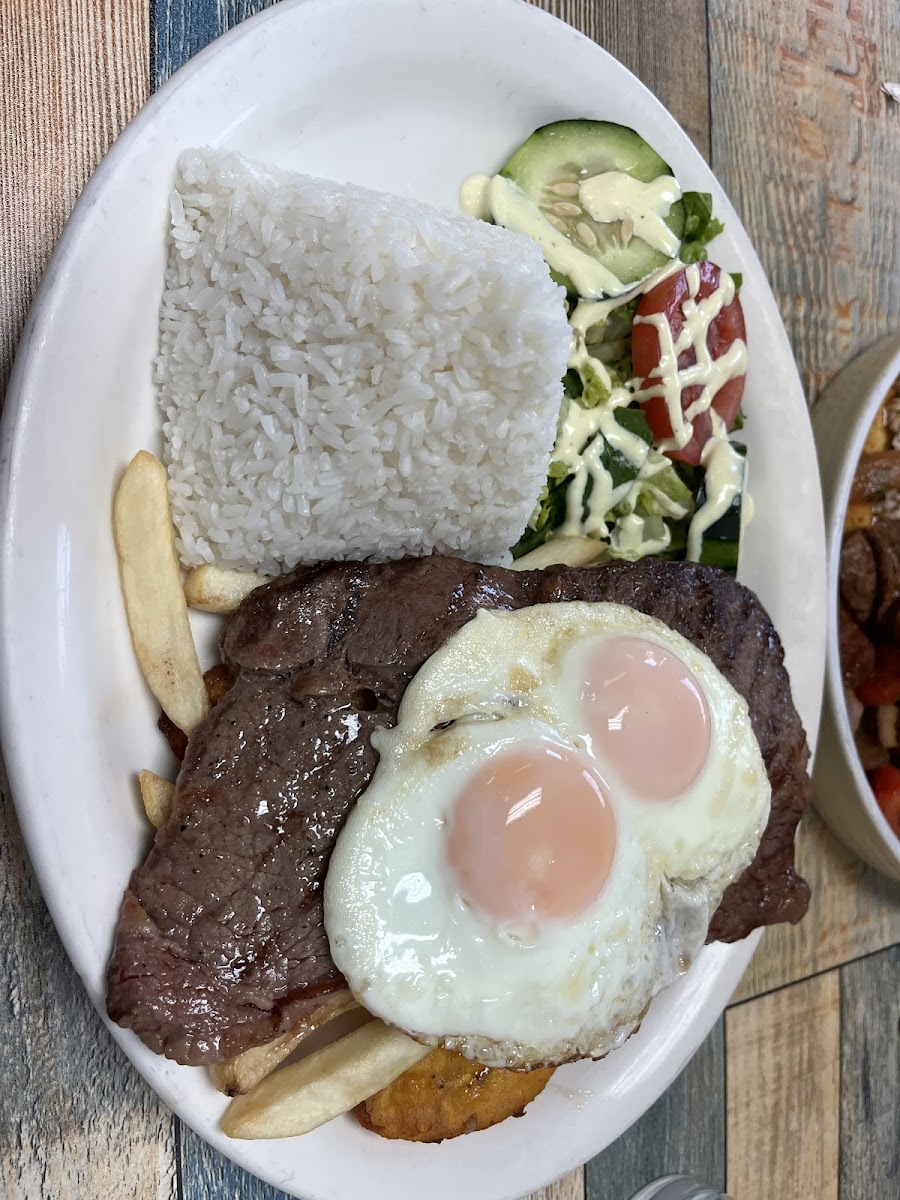 Bistec a Lo Pobre offers a hearty meal that is sure to satisfy. This dish features a tender steak paired with fried eggs, plantains, and rice. It’s a robust meal that highlights the essence of Peruvian comfort food-flavorful, filling, and comforting.